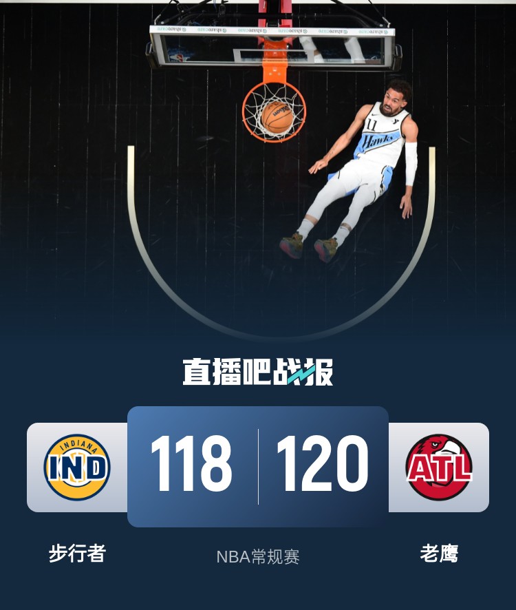 首节对决老鹰延续近期火热势头迅速抢占主动权,步行者前半节虽然打得非常被动但还算不错能够咬住比分,但后半节5分30秒里哑火仅得6分直接导致崩盘,老鹰则轰出一波22-6的攻势直接拉开20分的分差;次节步行者进攻端大幅回暖但防守端依旧阻止不了对手,特雷-杨半场轰下26分,老鹰半场命中率超过60%的情况下带着17分领先进入下半场。休息归来步行者节中一波8-0继续推快进攻节奏,老鹰则没能像上半场那样匹配强度导致优势不断被蚕食,特雷-杨神奇不再下半场状态明显下滑,而步行者末节又以8-2开局并在节中实现反超,不过最后时刻特雷-杨找回感觉联手勒韦尔拿下关键7分重夺领先,特纳则在最后时刻错失扳平罚球,随后拿到球权又错失绝杀。最终,老鹰主场再胜步行者拿下比赛。